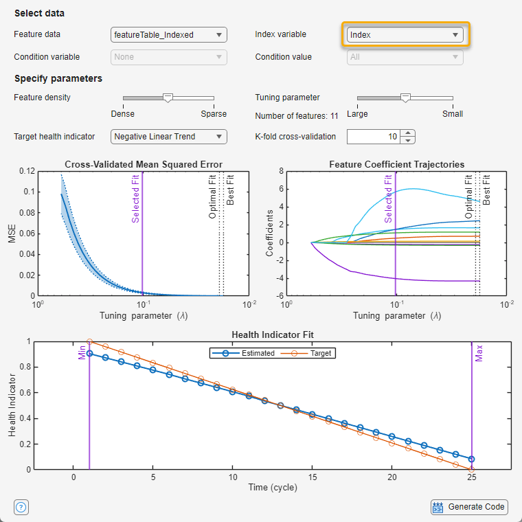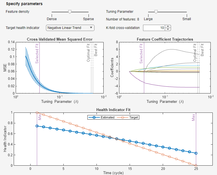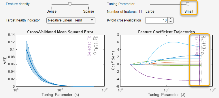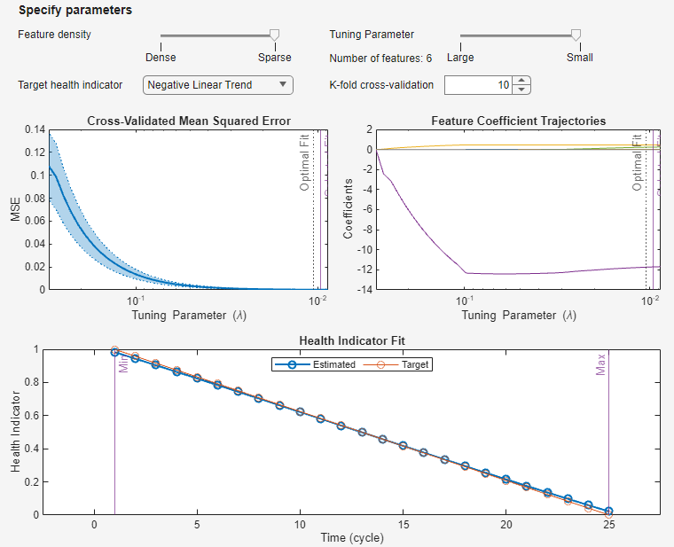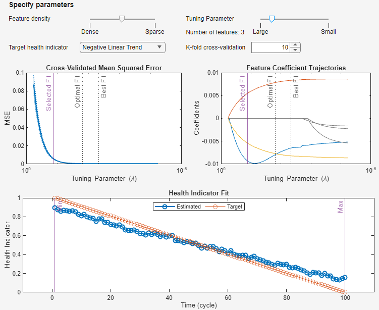 Use the Tuning Parameter slider to tune the MSE. As you move the slider from Large to Small, you reduce the MSE but increase the number of features that the HI includes.