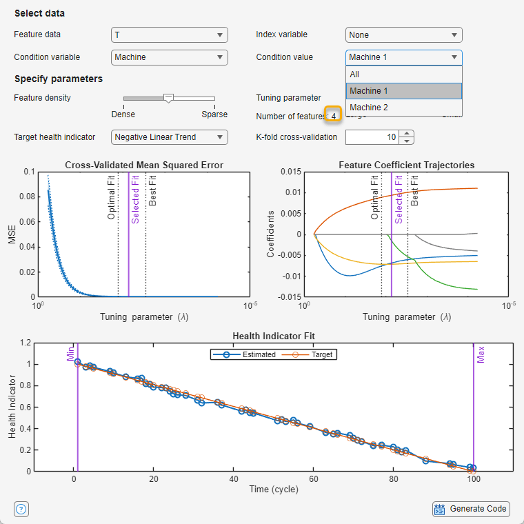 The app generates MATLAB® code that encapsulates the construction of the HI, which is expressed as a weighted sum, with a weight value for each feature that the HI includes.