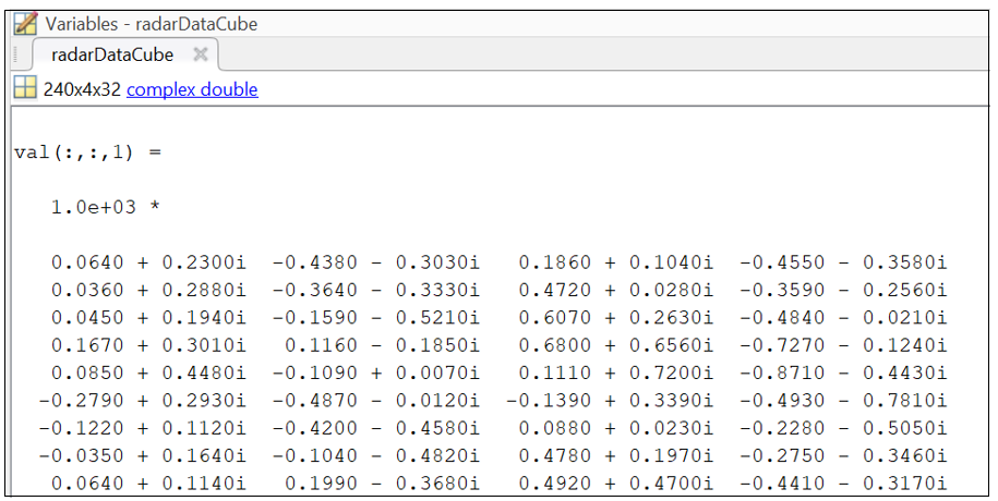 radarDataCube is a complex double-precision three-dimensional