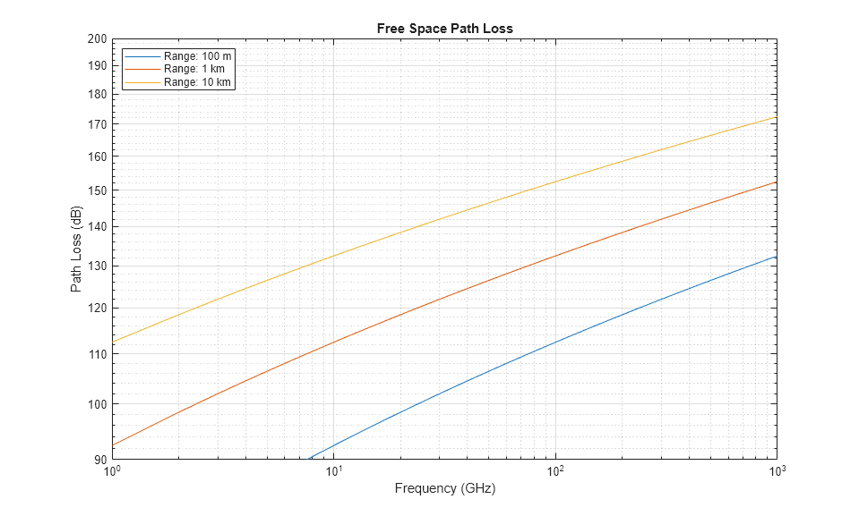 c = physconst('lightspeed'); R0 = [100 1e3 10e3]; freq = (1:1000).'*1e9; apathloss = fspl(R0,c./freq); loglog(freq/1e9,apathloss); grid on; ylim([90 200]); legend('Range: 100 m', 'Range: 1 km', 'Range: 10 km','Location','northwest'); xlabel('Frequency (GHz)'); ylabel('Path Loss (dB)'); title('Free Space Path Loss');