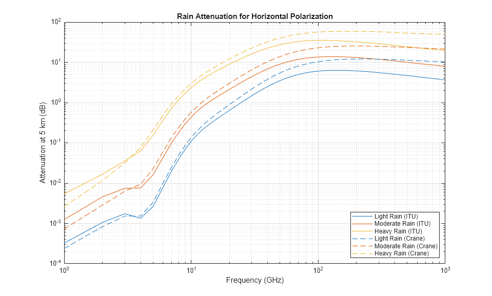 R0 = 5e3; % 5 km range rainrate = [1 4 20]; % rain rate in mm/h el = 0; % 0 degree elevation tau = 0; % horizontal polarization for m = 1:numel(rainrate) rainloss_itu(:,m) = rainpl(R0,freq,rainrate(m),el,tau)'; rainloss_crane(:,m) = cranerainpl(R0,freq,rainrate(m),el,tau)'; end loglog(freq/1e9,rainloss_itu); hold on; set(gca,'ColorOrderIndex',1); % reset color index for better comparison loglog(freq/1e9,rainloss_crane,'--'); hold off; grid on; legend('Light Rain (ITU)','Moderate Rain (ITU)','Heavy Rain (ITU)',... 'Light Rain (Crane)','Moderate Rain (Crane)','Heavy Rain (Crane)', ... 'Location','SouthEast'); xlabel('Frequency (GHz)'); ylabel('Attenuation at 5 km (dB)') title('Rain Attenuation for Horizontal Polarization');