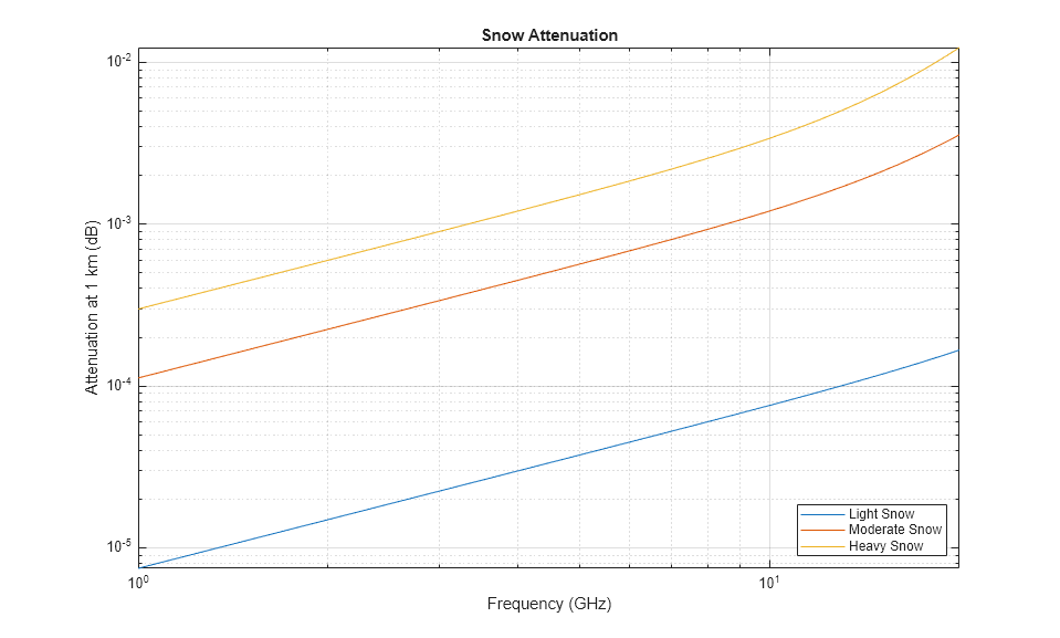 freq = (1:20)*1e9; R0 = 1e3; % 1 km range snowrate = [0.1 1.5 4]; % equivalent liquid water content in mm/h for m = 1:numel(snowrate) snowloss(:,m) = snowpl(R0,freq,snowrate(m)); end loglog(freq/1e9,snowloss); grid on; legend('Light Snow','Moderate Snow','Heavy Snow', ... 'Location','SouthEast'); xlabel('Frequency (GHz)'); ylabel('Attenuation at 1 km (dB)') title('Snow Attenuation');