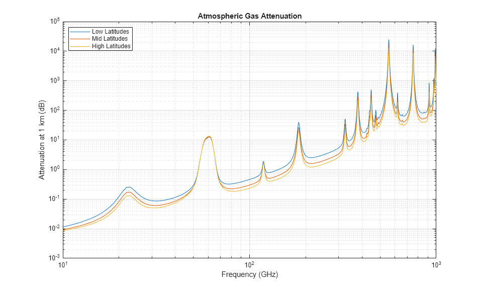 height = 2e3; el = -5; % elevation angle atmloss_low = tropopl(R0,freq,height,el,'LatitudeModel','Low'); atmloss_mid = tropopl(R0,freq,height,el,'LatitudeModel','Mid'); atmloss_high = tropopl(R0,freq,height,el,'LatitudeModel','High'); loglog(freq/1e9,atmloss_low); hold on; loglog(freq/1e9,atmloss_mid); loglog(freq/1e9,atmloss_high); hold off; grid on; legend('Low Latitudes','Mid Latitudes','High Latitudes','Location','northwest'); xlabel('Frequency (GHz)'); ylabel('Attenuation at 1 km (dB)') title('Atmospheric Gas Attenuation');