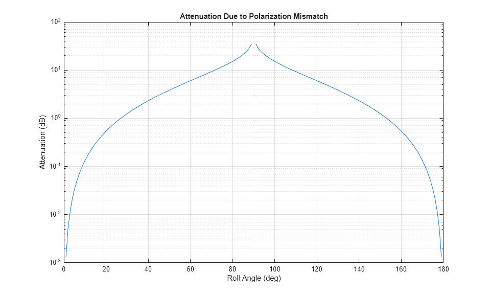 poltx = [0;1]; % [H;V] polarization polrx = [0;1]; postx = [0;0;0]; posrx = [100;0;0]; frmtx = eye(3); % transmit frame aligned with inertial rolls = 0:180; for m = 1:numel(rolls) frm_r = rotx(rolls(m)); rho(m) = polloss(poltx,polrx,posrx,frm_r,postx,frmtx); end semilogy(rolls,rho); grid on; xlabel('Roll Angle (deg)'); ylabel('Attenuation (dB)'); title('Attenuation Due to Polarization Mismatch');