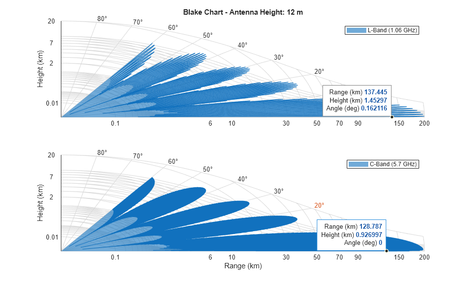 function helperPlotBlakeChart(vcp,vcpang,N) % Calculate refraction exponent DelN = -7.32*exp(0.005577*N); rexp = log(N./(N + DelN)); subplot(211) blakechart(vcp{1},vcpang{1},'SurfaceRefractivity',N,'RefractionExponent',rexp); legend('L-Band (1.06 GHz)') xlabel('') title ('Blake Chart - Antenna Height: 12 m') subplot(212) blakechart(vcp{2},vcpang{2},'SurfaceRefractivity',N,'RefractionExponent',rexp); allc = get(gca,'Children'); set(allc(11),'Color',[0.8500 0.3250 0.0980]) % Change line color title('') legend('C-Band (5.7 GHz)') end