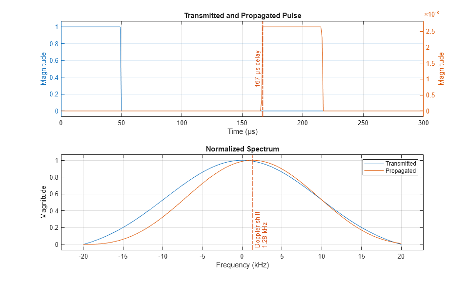function [delay, dop] = helperPlotDelayAndDopplerShift(wav,y2ray,Fs) % Plot transmitted and propagated pulse t = 1e6*(0:numel(wav)-1)'/Fs; subplot(211) yyaxis left plot(t,abs(wav)) ylabel('Magnitude') yyaxis right plot(t,abs(y2ray)) grid on axis padded xlim([0 300]) xlabel(['Time (' char(0x00B5) 's)']) ylabel('Magnitude') title('Transmitted and Propagated Pulse') % Annotation delay = midcross(abs(y2ray),t/1e6,'MidPercentReferenceLevel',80); % seconds delay = delay(1); xl = xline(1e6*delay,'-.',... % Annotation {[num2str(round(1e6*delay)),' ',char(0x00B5) 's delay']},'Color',[0.8500 0.3250 0.0980]); xl.LabelVerticalAlignment = 'middle'; xl.LabelHorizontalAlignment = 'left'; xl.LineWidth = 2; % Plot power spectrum subplot(212) [p,f] = pspectrum([wav y2ray],Fs,'FrequencyLimits',[-20e3 20e3]); p = abs(p); plot(1e-3*f,rescale(p,'InputMin',min(p),'InputMax',max(p))); axis padded grid on [~,idx]=max(p); dop = f(idx(2))-f(idx(1)); % Hz xlabel('Frequency (kHz)') ylabel('Magnitude') title('Normalized Spectrum') xl = xline(1e-3*dop,'-.',... % Annotation {'Doppler shift',[num2str(round(dop)*1e-3) ' kHz']},'Color',[0.8500 0.3250 0.0980]); xl.LabelVerticalAlignment = 'bottom'; xl.LineWidth = 2; legend('Transmitted','Propagated') end