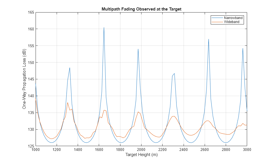 y2ray_wb = channel(repmat(wav,[1 numel(hTarget)]),pos_radar,pos_target,vel_radar,vel_target); L2ray_wb = pow2db(bandpower(wav))-pow2db(bandpower(y2ray_wb)); hold on; plot(hTarget,L2ray_wb); hold off; legend('Narrowband','Wideband');