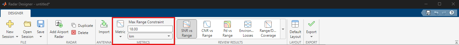 The computed metrics, which are shown in the Results table, can be constrained by either the maximum range or the probability of detection. A choice of which variable to use as a constraint is made through the Metric button in the Metric section of the toolstrip. Selecting maximum range as a constraint means that the performance metrics displayed in the Results table are computed at the specified maximum range. Selecting the probability of detection as a constraint means that the displayed metrics are computed assuming the specified value of the probability of detection. In this example we are interested in two ranges: 1) 18 km for manned aircraft, and 2) 8 km for UAS. We start with the manned aircraft and set the Metric in the toolstrip to the maximum range constraint of 18 km.