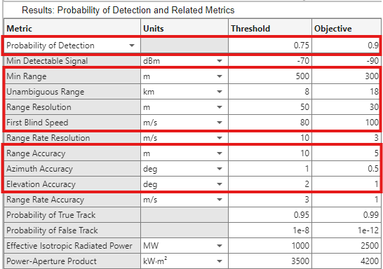 As the next step, we populate the Threshold and Objective values of the Results table with the numbers given in the specification. In this example the specification provides only a single value for each performance metric. We use this value to set the Objective requirement. We then set the corresponding Threshold to a reasonable value close to the Objective. Although the desired performance of the system is defined by the Objective requirement, the system is considered to have an acceptable performance if the Threshold requirement is met. This flexibility is needed to create the trade-space for selecting the design parameters, which otherwise could be difficult or impossible to choose. Since the specification does not provide requirements for all the metrics shown in the table, we leave the requirements for these metrics set to the default values.