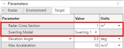 The target parameters are set in the Target parameter panel. Since we are considering the small manned aircraft first, we set the radar cross section of the target to 1 m. The Swerling Model is changed to Swerling 1 to model more realistic fluctuating targets.