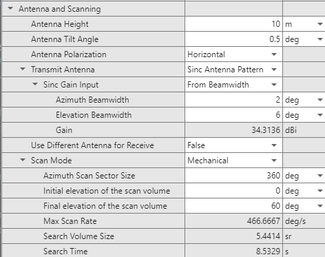 Antenna and Scanning. Antenna height, tilt, and polarization are left unchanged. The azimuth and elevation antenna beamwidth are set to 2 and 6 degrees, respectively, to meet the azimuth and elevation accuracy requirements. The Scan Mode is set to