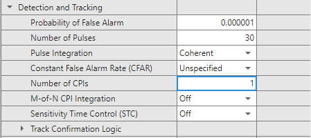 Detection and Tracking. The probability of false alarm is set to the required value of 1e-6. The number of coherently integrated pulses is selected such that the