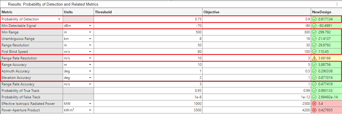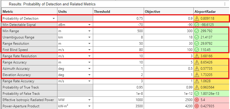 After the requirements and the target parameters have been set, we can start adjusting the radar design parameters such that the computed metrics meet the stated requirements. The Radar Designer app provides a convenient way to monitor the status of the computed metrics while changing the value of the design parameters. The entries of the Results table are color coded to indicate the status of the computed metrics. Metrics that meet the corresponding Objective requirement are colored in green, metrics with the values between the Threshold and Objective are colored in yellow, and the metrics that do not meet the Threshold requirement are colored in red. The same colors are also used in the SNR vs. Range and Pd vs. Range plots to show the ranges at which the detection requirements are satisfied. Gray is also used in the plots to mark the region beyond the maximum range and less than the objective requirement.
