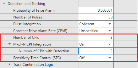 The probability of detection can be improved by either increasing the SNR available at the receiver or by decreasing the SNR required to make a detection (the detectability factor). The latter approach might be more attractive in practice since decreasing the detectability factor can be accomplished through application of signal processing techniques that do not require making changes in the hardware. The detectability factor can be decreased by integrating more pulses. However, target RCS fluctuation usually imposes a limit on the amount of pulses that can be coherently integrated. A possible solution to integrating more pulses while addressing the problem of the RCS fluctuation is the M-of-N integration over multiple coherent processing intervals (CPIs). Within each CPI the pulses are integrated coherently, and then the M-of-N integration is applied across CPIs. Navigating to the Radar parameter panel and setting the number of CPIs in the Detection and Tracking section to 3 and the number of CPIs with a detection to 2 increases the resulting probability of detection from 0.55 to 0.8.