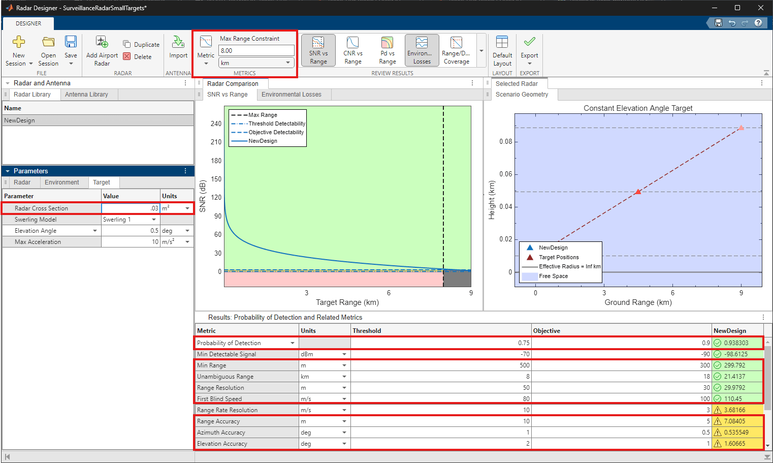 To verify whether this radar design will have a satisfactory performance when the target is a small UAS, we change the target RCS to 0.03 m and set the metric constraint to maximum range of 8 km. The SNR vs. Range plot shows that the available SNR for this design is above the Objective Detectability line at 8 km, and the resulting probability of detection at that range is 0.94, which is well above the required value. The system is able to satisfy the Objective requirement for the probability of detection at 8 km because the impact of the atmospheric attenuation is smaller at closer ranges.