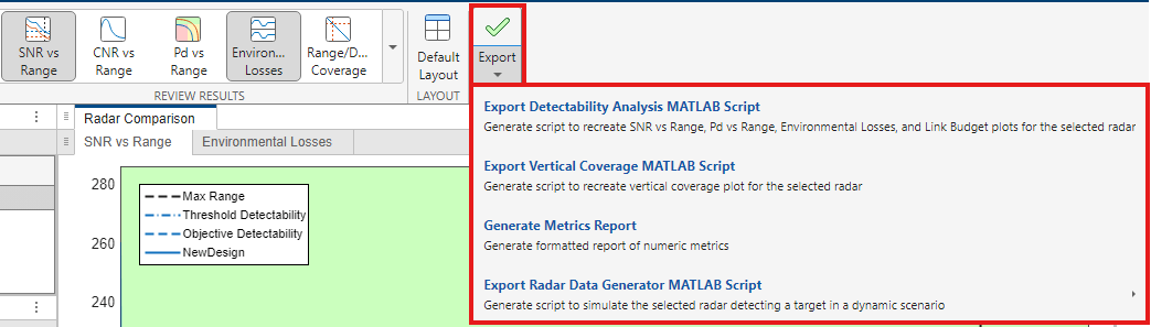 The Radar Designer allows exporting the created design as a MATLAB script by clicking the Export button in the Export section of the toolstrip and selecting Export Detectability Analysis MATLAB Script. The exported script contains the selected radar, target, and environment parameters, and reproduces the SNR vs. Range and the Environmental Losses plots shown in this example. It can be used to further experiment, enhance, and modify the design. In addition, the results shown in the Results table can also be exported as a separate MATLAB script by clicking Export and then choosing Generate Metrics Report. When executed, this script outputs a formatted report for the computed metrics.