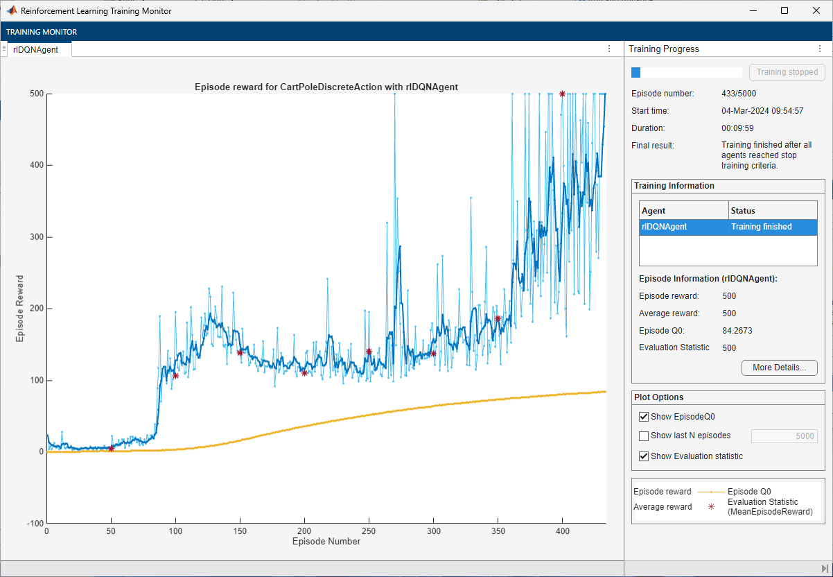 • By default, calling train opens the Reinforcement Learning Training Monitor, which lets you visualize the progress of the training. The Reinforcement Learning Training Monitor plot shows the reward for each episode, a running average reward value, and the critic estimate Q0 (for agents that have critics). The Reinforcement Learning Training Monitor also displays various episode and training statistics. To turn off the Reinforcement Learning Training Monitor, set the Plots option of trainOpts to "none".