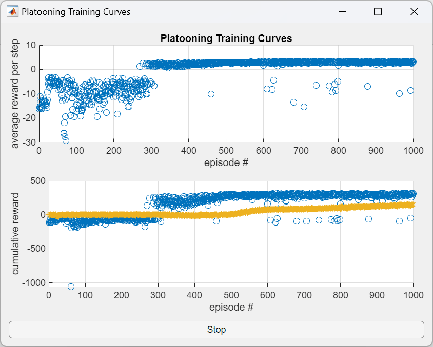 PlatooningTrainingCurvePlotterobject is a helper object to plot training data while the training is running.You can stop the training using a Stop button in the training plot.