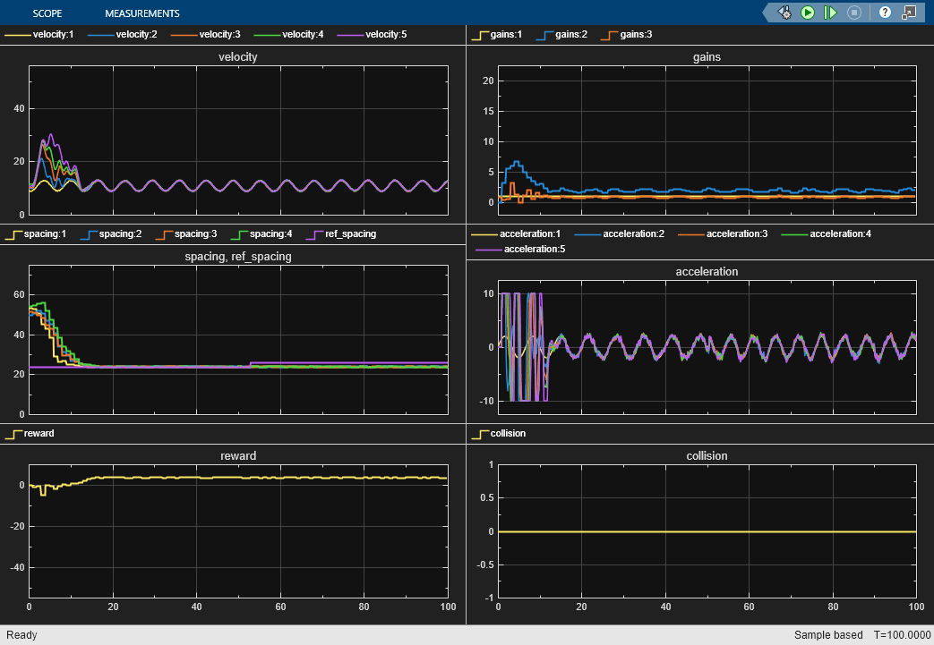 From the plots, you can see that the trained policy generates adaptive gains that adequately track the desired spacing for all vehicles.