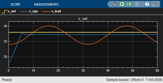 • The lead car changes speed from 24 m/s to 30 m/s periodically (third plot). The ego car maintains a safe distance throughout the simulation (second plot).