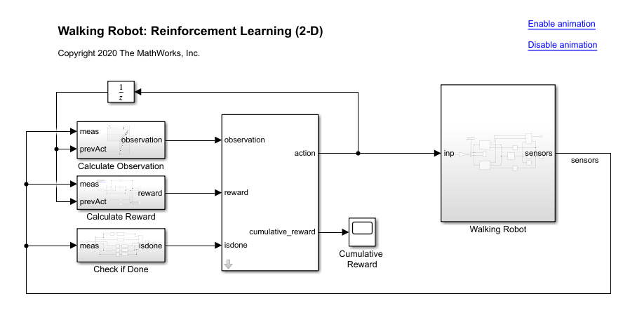 blk = mdl + "/RL Agent"; env = rlSimulinkEnv(mdl,blk,obsInfo,actInfo); env.ResetFcn = @(in) walkerResetFcn(in, ... upper_leg_length/100, ... lower_leg_length/100, ... h/100);