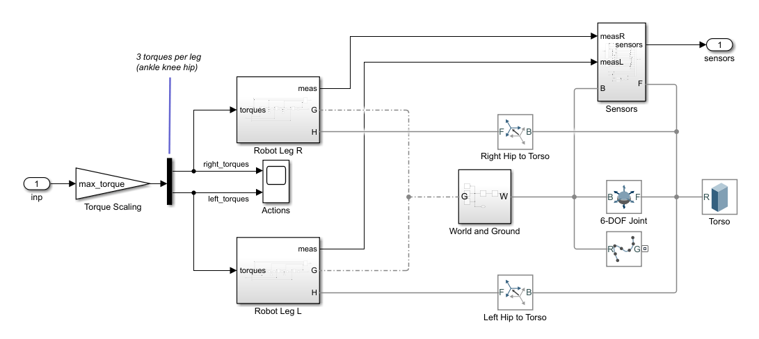 The reinforcement learning environment for this example is a biped robot. The training goal is to make the robot walk in a straight line using minimal control effort.