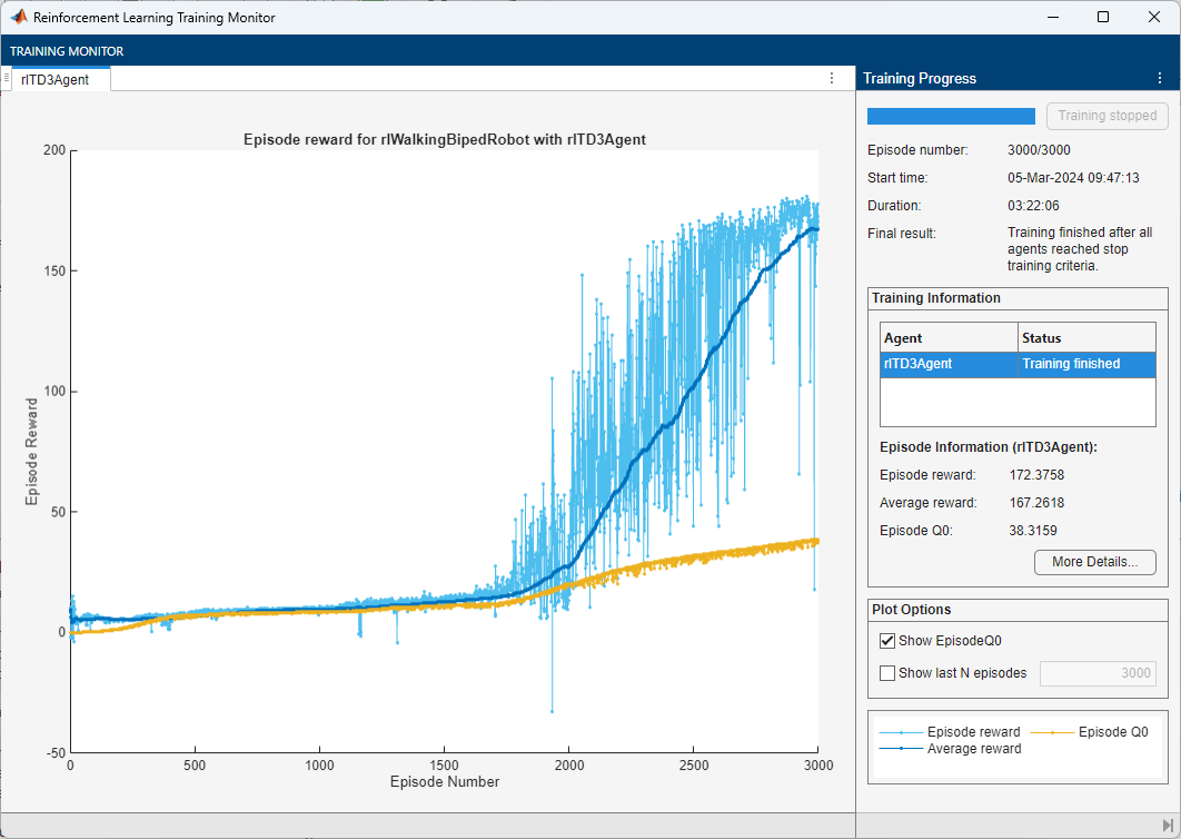maxEpisodes) by settingStopTrainingCriteriato"none". Doing so allows the comparison of the learning curves for multiple agents over the entire training session.