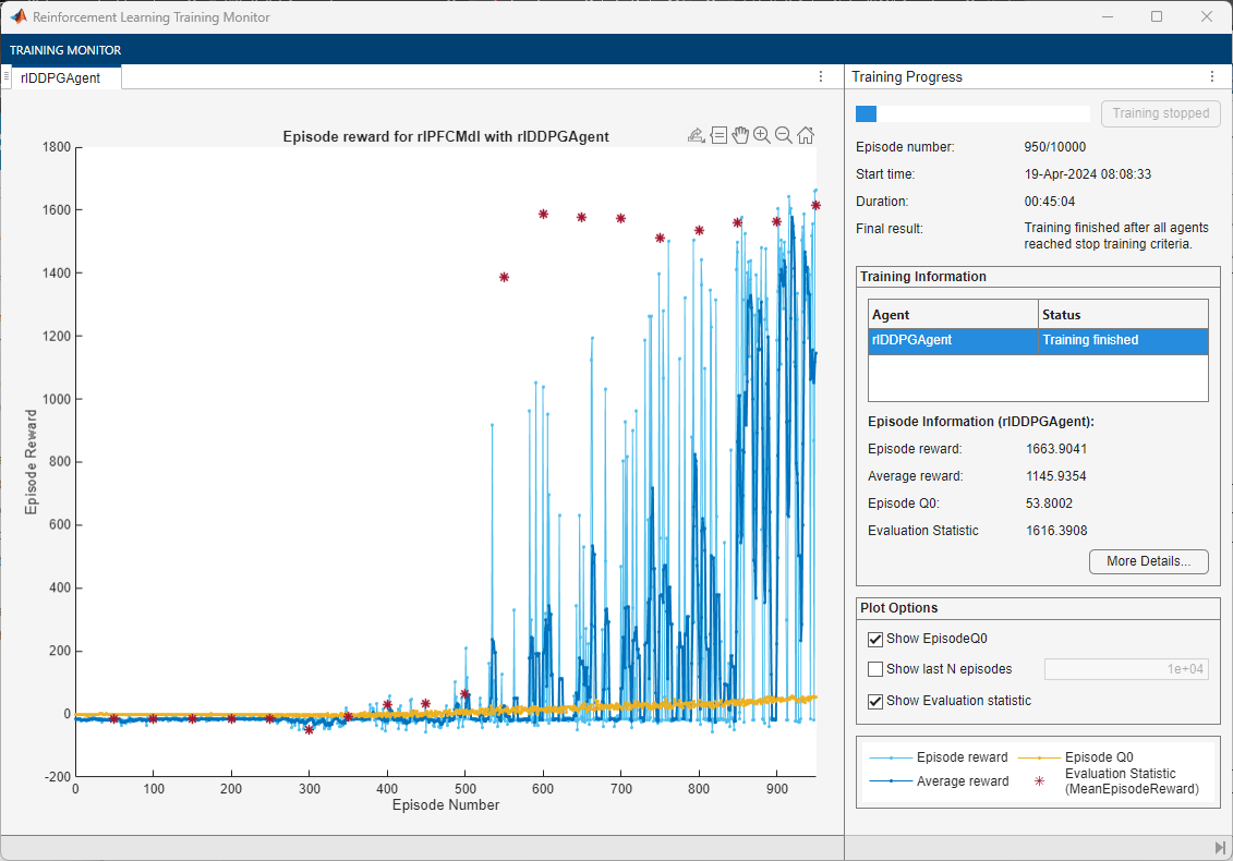 maxepisodes = 1e4; maxsteps = ceil(Tf/Ts); trainingOpts = rlTrainingOptions(... MaxEpisodes=maxepisodes,... MaxStepsPerEpisode=maxsteps,... Verbose=false,... Plots="training-progress",... StopTrainingCriteria="EvaluationStatistic",... StopTrainingValue=1600); % agent evaluator evl = rlEvaluator(EvaluationFrequency=50, NumEpisodes=5);