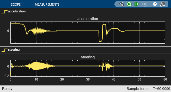 To simulate the physical limitations of the vehicle dynamics, constrain the acceleration to the range [–3,2] (m/s^2), and the steering angle to the range [–0.2618,0.2618] (rad), that is -15 and 15 degrees.