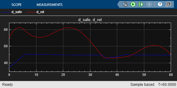 The reference velocity for the ego car is defined as follows. If the relative distance is less than the safe distance, the ego car tracks the minimum of the lead car velocity and driver-set velocity. In this manner, the ego car maintains some distance from the lead car. If the relative distance is greater than the safe distance, the ego car tracks the driver-set velocity. In this example, the safe distance is defined as a linear function of the ego car longitudinal velocity , that is, . The safe distance determines the tracking velocity for the ego car.