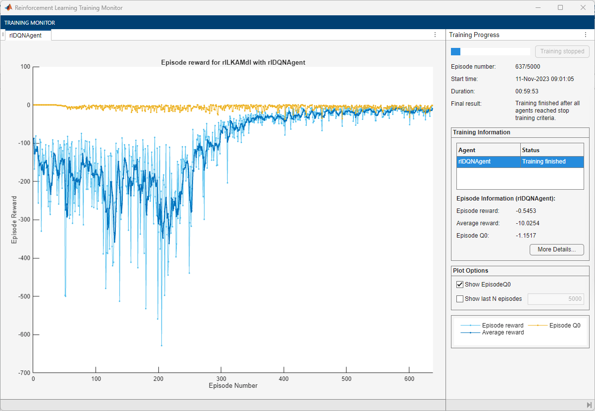maxepisodes = 5000; maxsteps = ceil(T/Ts); trainingOpts = rlTrainingOptions(... MaxEpisodes=maxepisodes,... MaxStepsPerEpisode=maxsteps,... Verbose=false,... Plots="training-progress",... StopTrainingCriteria="EpisodeReward",... StopTrainingValue=-1,... SaveAgentCriteria="EpisodeReward",... SaveAgentValue=-2.5);
