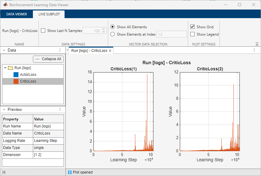To create plots in the Reinforcement Learning Data Viewer, select a data from the Data panel and a choice of plot from the toolstrip. The following images show the actor and critic losses logged during training.