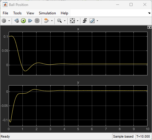 Specify an initial position for the ball with respect to the plate center. To randomize the initial ball position during simulation, set the userSpecifiedConditions flag to false.