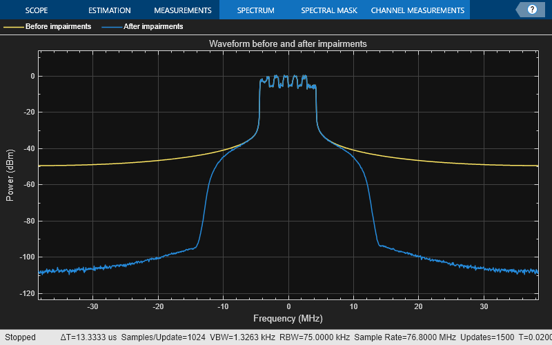 scope = spectrumAnalyzer('SampleRate',sr,... 'ChannelNames',{'Before impairments','After impairments'},... 'Title', 'Waveform before and after impairments'); scope([(1/peakPower).*txWaveform,rxWaveform]); release(scope);