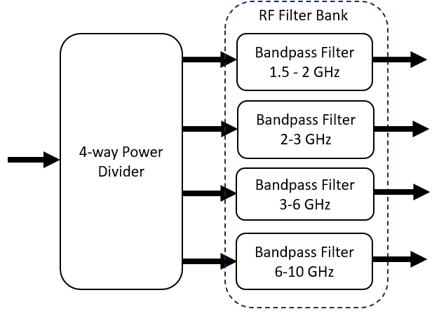 A Power divider is used to divide the signal into four ports to which the filters are connected. Use the powerDividerCorporate object and the Splitter as a wilkinsonSplitterWideband object.