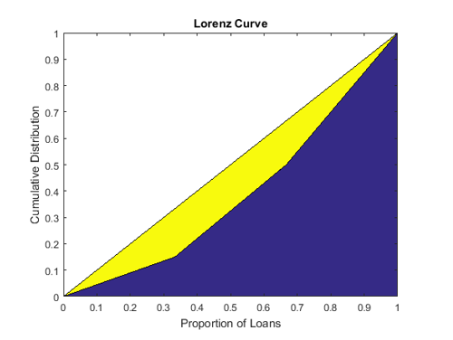 The Lorenz curve is a plot of L versus p, or the cumulative proportion of portfolio value versus cumulative proportion of the number of loans (sorted from smallest to largest).