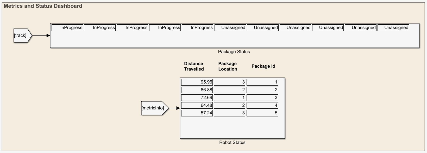 For each of the packages, the dashboard in the model shows if the package is "InProgress", "Unassigned", or "Delivered". Robot Status displays the distance travelled, package location, and a package ID.