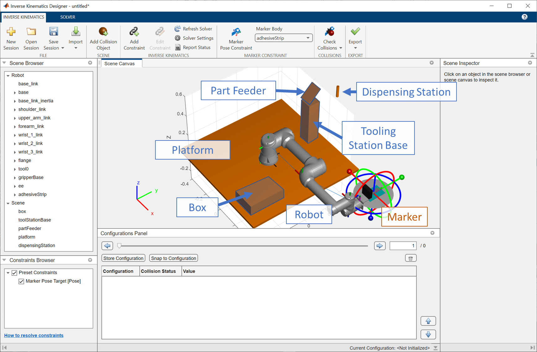 Click Add to add these objects to the scene. In the Scene Canvas, to reposition the scene so it fits. Fore more information, see the Use Scene Canvas and Move Robot example on the Inverse Kinematics Designer page.
