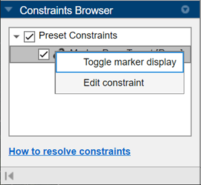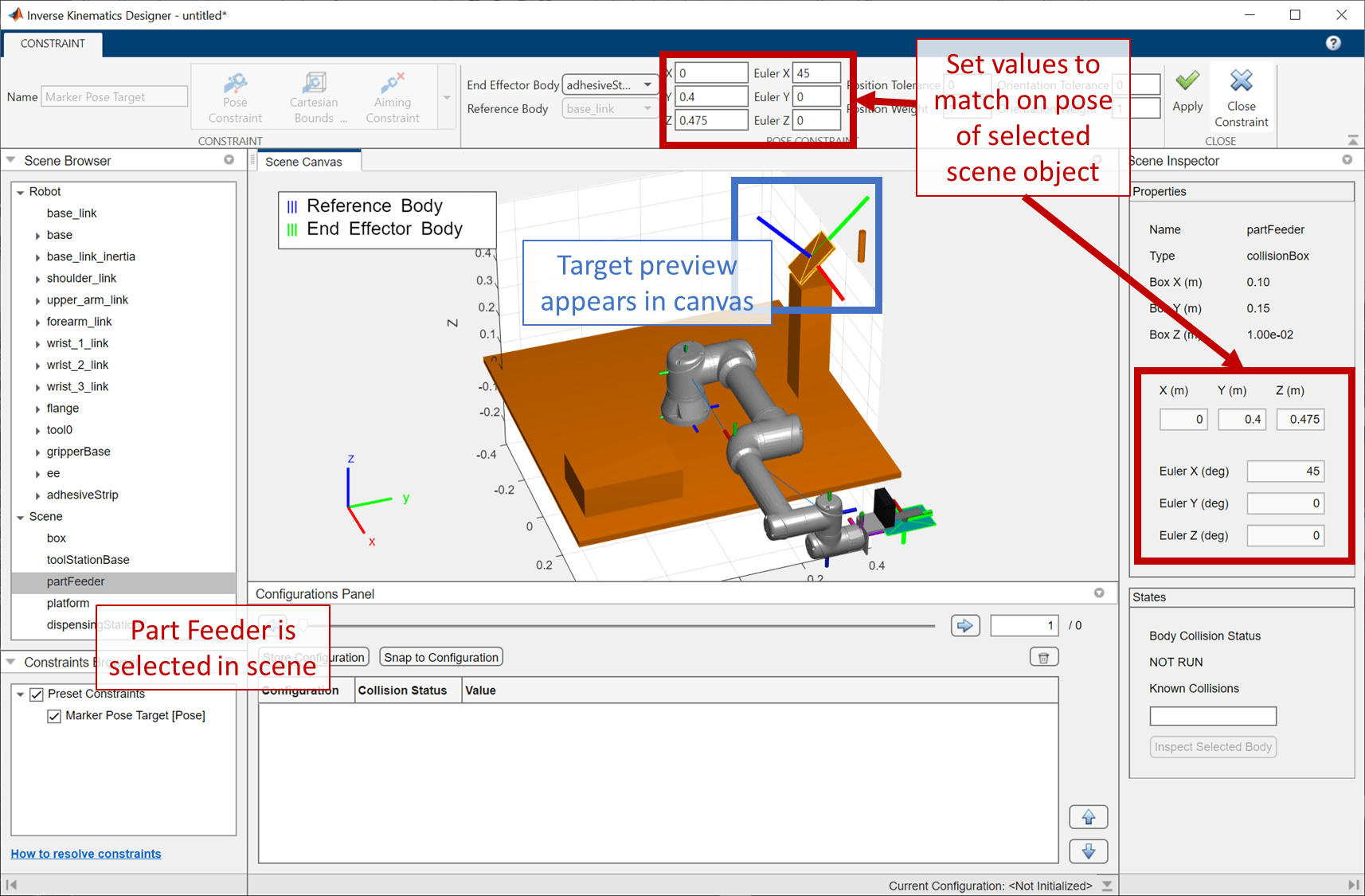 Move the marker pose target to this pose so the solver finds a configuration in which the robot is aligned in the picking task pose. While you can position the pose target using hand-tuning, the most accurate way is to directly set the end-effector pose. Select Marker Pose Constraint from the app toolstrip, or right-click the Marker Pose Target in the Constraints Browser and select Edit constraint. Once the Constraint tab opens, enter the pose of the object in the Pose Constraint section using these values: