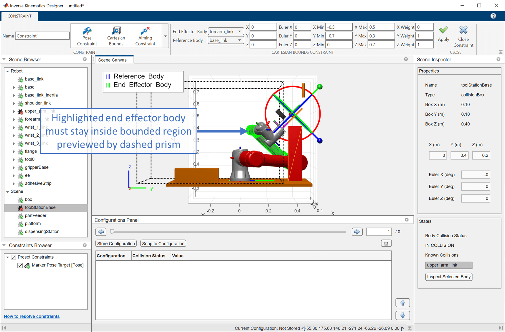 You can use a bounds constraint to keep bodies inside a particular bounded range. In this case, the bound should keep the distal end of the upper arm from contacting the base. Since that end of the link is near coincident with the original (and reference point) of the forearm link, a Cartesian bounds constraint that prevents the forearm from reaching the base along Y-axis should prevent this collision. To add the constraint, on the Inverse Kinematics tab, click Add Constraint > Cartesian Bounds Constraint.