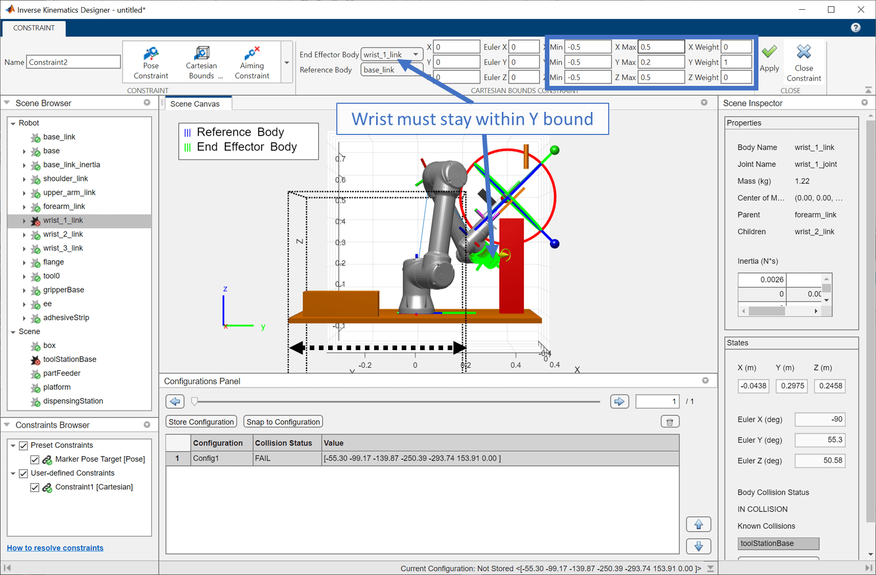 Click Apply to apply the constraint, then exit the Constraints tab. The robot adjusts its position, but a and collision-check confirms that while the arm links are no longer in collision with the base, the wrist is still in collision. Create another Cartesian bounds constraint with a Y range of -0.5 meters to 0.2 meters to prevent this collision. Set the weights on the other bounds to 0, so that only Y is considered.