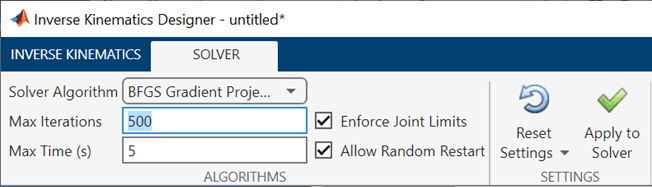 The default solver parameters are set to be fairly fast with just 50 iterations, which can struggle with a higher number of constraints. In the toolstrip, click Solver Settings or select the Solver tab. Then set the value of the number of Maximum Iterations to 500. Click Apply to run the solver and return to the Inverse Kinematics tab.