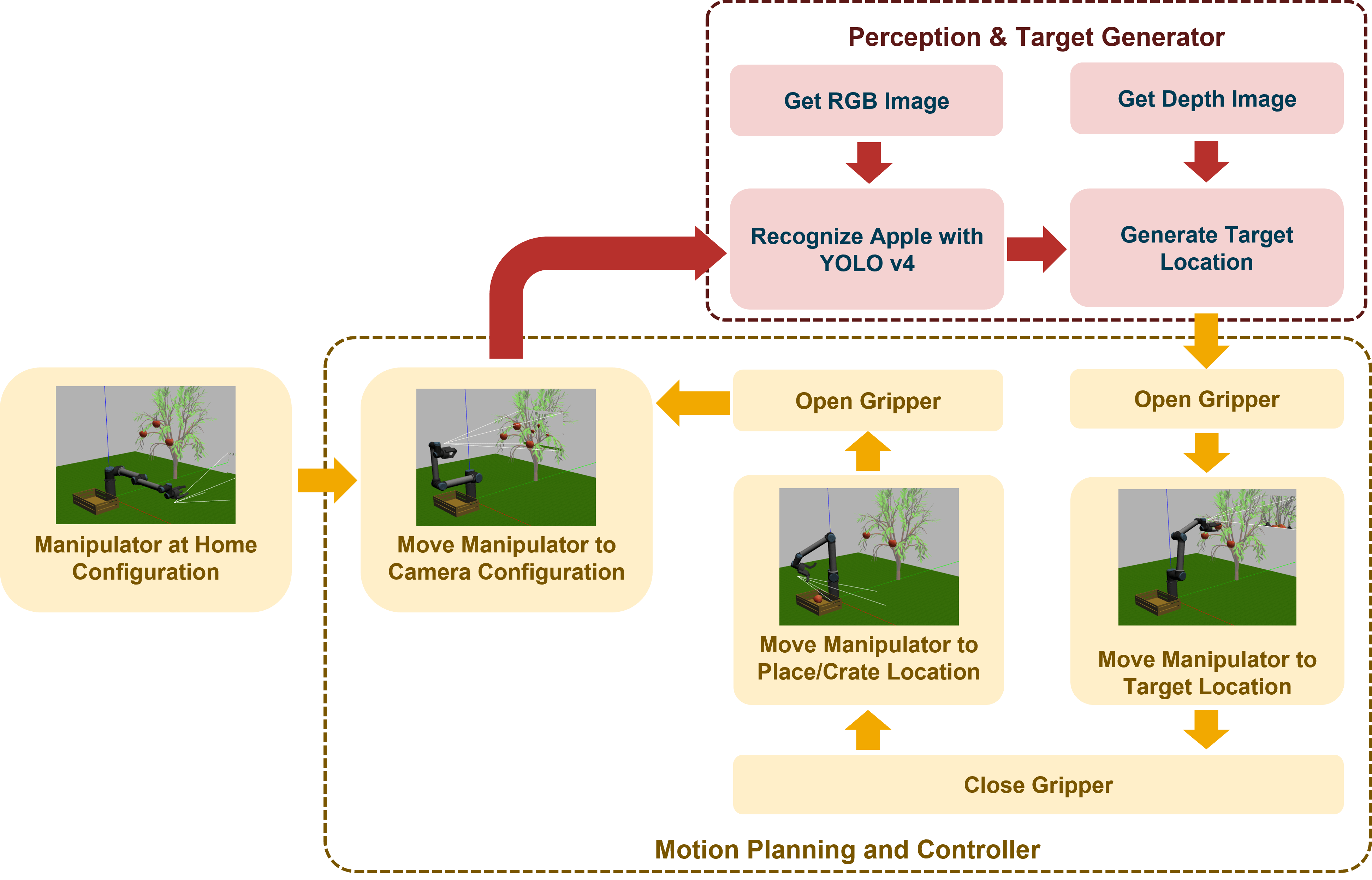 At the start of simulation, the manipulator is in its home configuration. Then, the manipulator moves to the image grab position to collect RGB-D images from Gazebo. When the robot receives the images, it detects and identifies the apples using a YOLO v4 object detection network. The robot then calculates, the target location to the Motion Planning subsystem. The model then uses the manipulatorRRT object to plan motion between the image grab position and the calculated target position. The gripper fingers open while the robot approaches the target apple and close after the robot picks the apple. The model then plans the motion between the target location and the apple drop location. Then, the manipulator moves towards the drop location and opens the gripper to release, placing the apple in the crate. Next, the manipulator moves back to the image grab position. This process continues until the robot removes all the apples are removed from the tree.