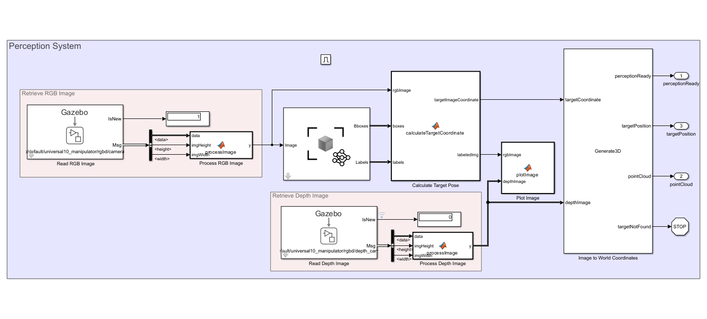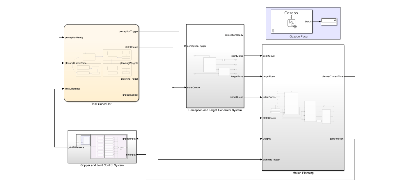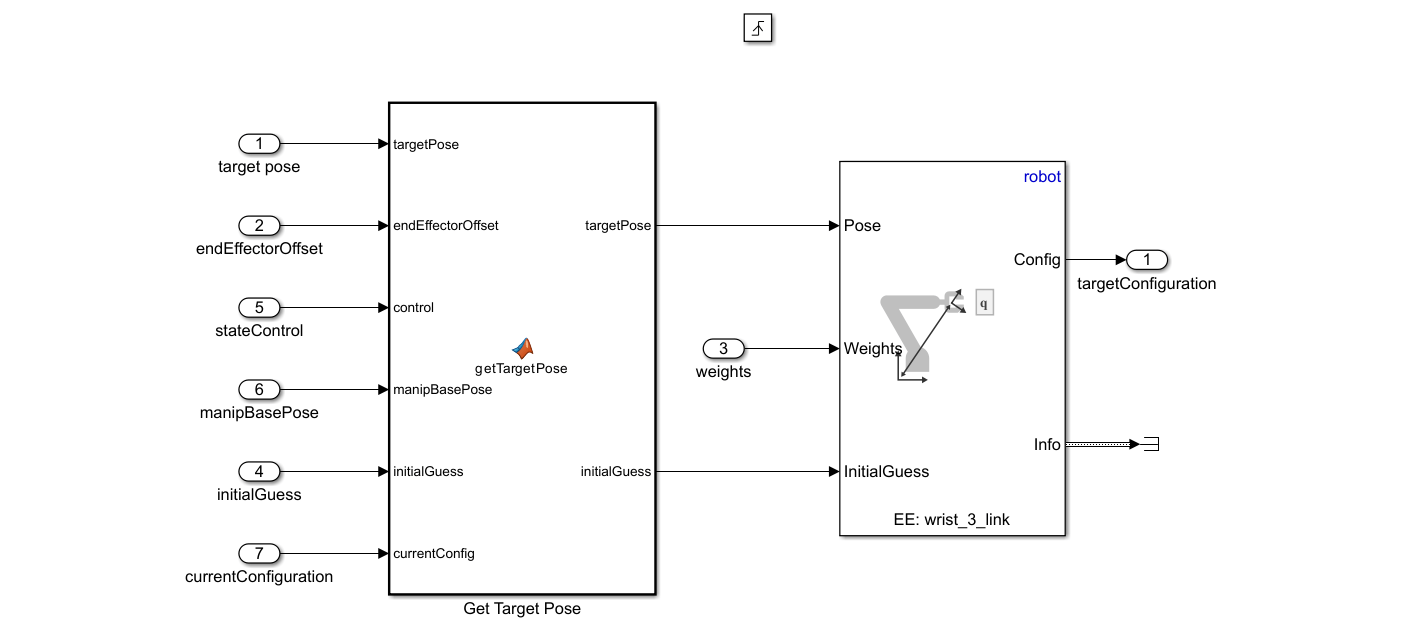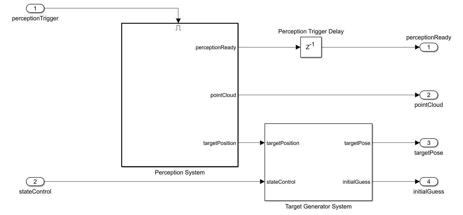 The Perception and Target Generator System generates the target pose and sends it to the Target Configuration Generator block to generate the target joint configuration. The Get Target Pose block calculates the target pose using the manipulator base position, end-effector offset and, current state input. Further, the Inverse Kinematics block calculates the target joint configuration from the calculated target pose, weights, and initial guess.