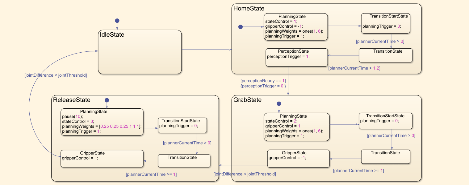 A Stateflow chart defines the different states of the robot arm during the pick-and-place workflow. The chart contains these steps.