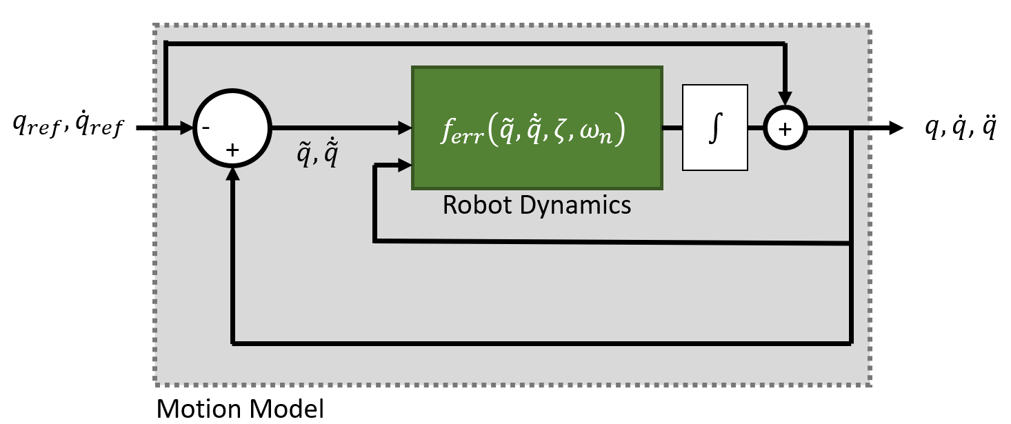 When the motion model is defined as a robot subject to computed torque control, the motion model uses standard rigid body Robot Dynamics, but the generalized force input is given by a control law that compensates for the rigid body dynamics and instead assigns a second-order error dynamics response.