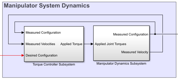 The manipulator dynamics consists of two components, a controller to generate torque signals and a dynamics model to model the dynamics of the manipulator given these torque signals. The controller in the example uses a feed-forward component calculated through the inverse dynamics of the manipulator and a feedback PD controller to correct for error. The model of the manipulator uses the Forward Dynamics block that works with a rigidBodyTree object. For more sophisticated dynamics and visualization techniques, consider utilizing tools from the Control Systems Toolbox™ blockset and Simscape™ Multibody™ to replace the Forward Dynamics block.