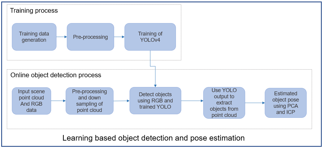 Online object detection: Detect objects using real-time raw RGBD data using a pre-trained YOLO v4 network, and estimate object pose using Principle Component Analysis (PCA) and Iterative Closest Point (ICP) algorithm.