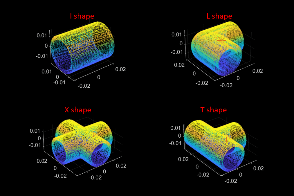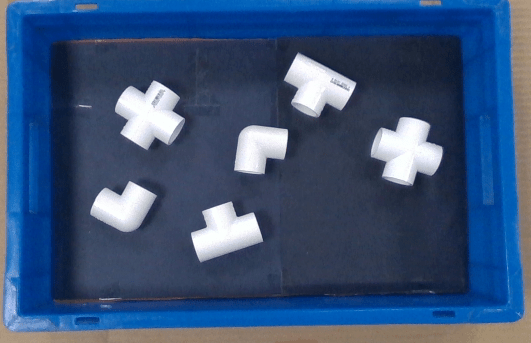 This example uses PVC fittings in four shapes, shown in this diagram, to demonstrate the intelligent bin picking workflow.