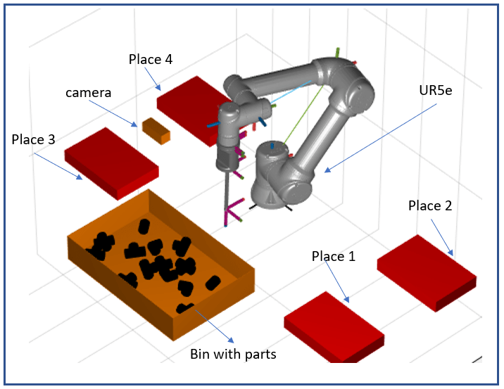 This example shows you how to implement semi-structured intelligent bin picking of four different shapes of standard PVC fittings. This example uses a Universal Robots UR5e to perform the bin picking task, enabling successful detection and classification of objects.Then, it uses the suction gripper connected to the cobot to sort the picked up items into four different bins.